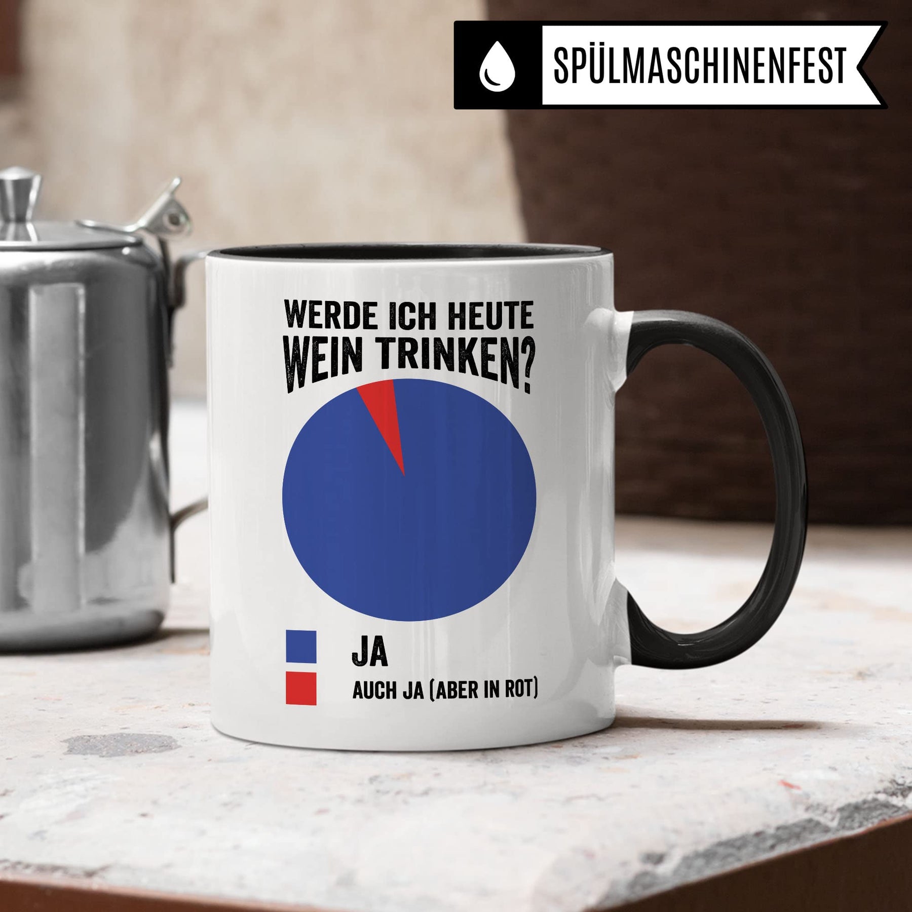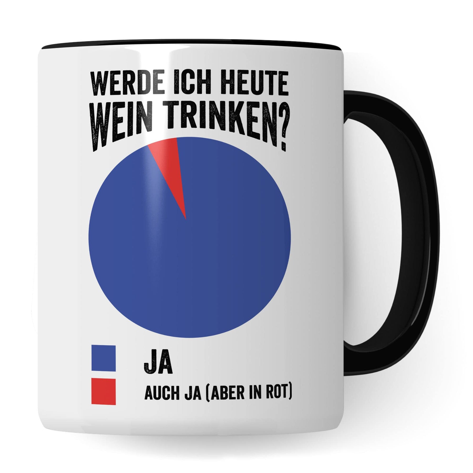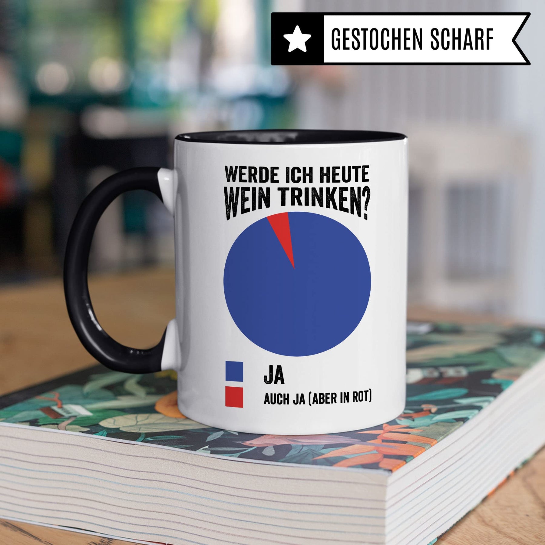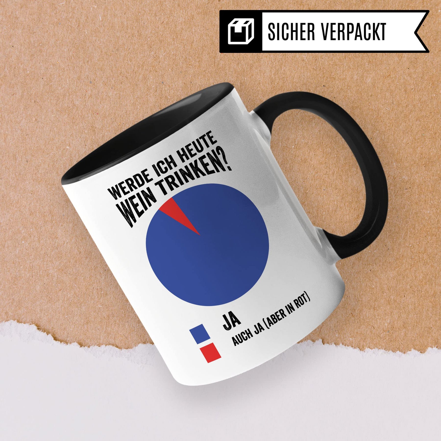 WERDE ICH HEUTE WEIN TRINKEN? O JA O AUCH JA (ABER IN ROT). Witzige Wein Tasse für alle, die gerne Wein trinken. Ein tolles Geschenk um einer Weinliebhaber eine Freude zu machen. Garantiert spülmaschinenfester Aufdruck - mit hochwertiger Sublimationstechnik bedruckt und deshalb besonders robust. Alle unsere Tassen werden zu 100% in Deutschland, zu fairen Bedingungen und mit Liebe bedruckt. Das ideale Geschenk, egal ob die Tasse als Kakaobecher, Kaffeetasse oder Kaffeebecher genutzt wird.