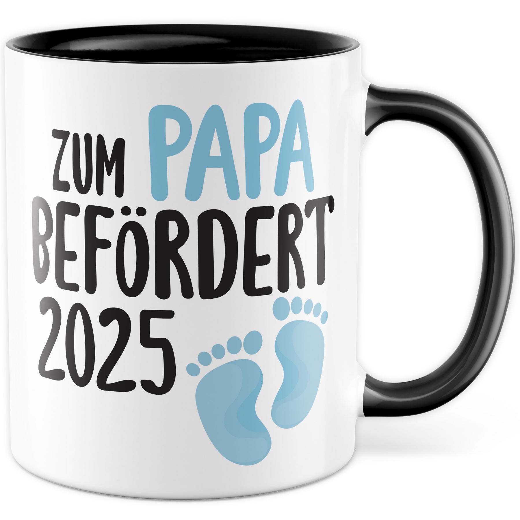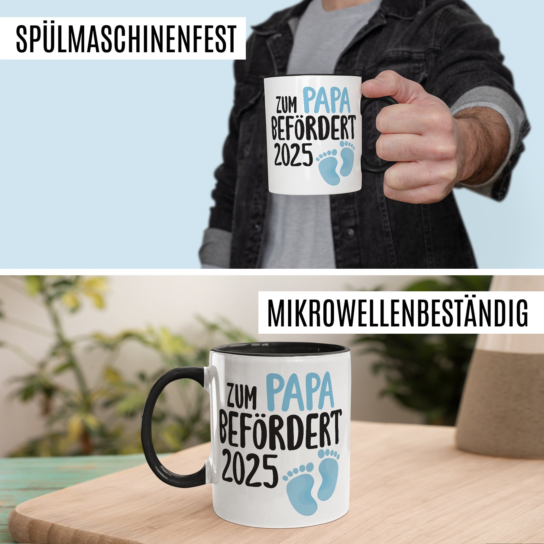 Zum Papa befördert - 2025, Tasse aus weißer Keramik mit Geschenk Spruch. Eine Geschenkidee für werdende Väter. Garantiert spülmaschinenfester Aufdruck - mit hochwertiger Sublimationstechnik bedruckt und deshalb besonders robust. Alle unsere Tassen werden zu 100% in Deutschland, zu fairen Bedingungen und mit Liebe bedruckt. Das ideale Geschenk, egal ob die Tasse als Kakaobecher, Kaffeetasse oder Kaffeebecher genutzt wird.