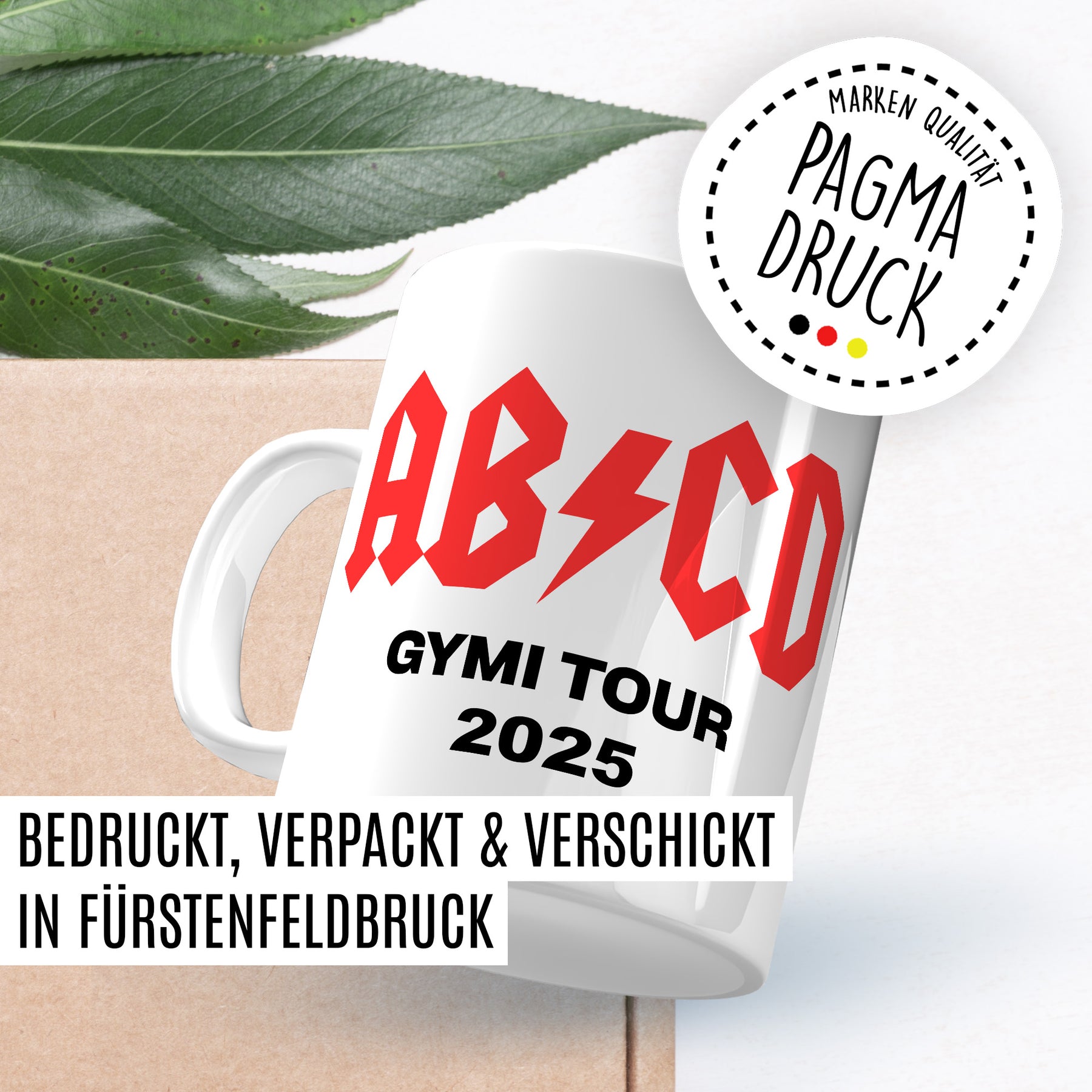 ABCD GYMI TOUR 2025. Witzige 5. Klässler Tasse für alle, die 2025 aufs Gymnasium kommen. Ein tolles Geschenk um einem Rock begeistertem Schulkind eine Freude zu machen. Garantiert spülmaschinenfester Aufdruck - mit hochwertiger Sublimationstechnik bedruckt und deshalb besonders robust. Alle unsere Tassen werden zu 100% in Deutschland, zu fairen Bedingungen und mit Liebe bedruckt. Das ideale Geschenk, egal ob die Tasse als Kakaobecher, Kaffeetasse oder Kaffeebecher genutzt wird.